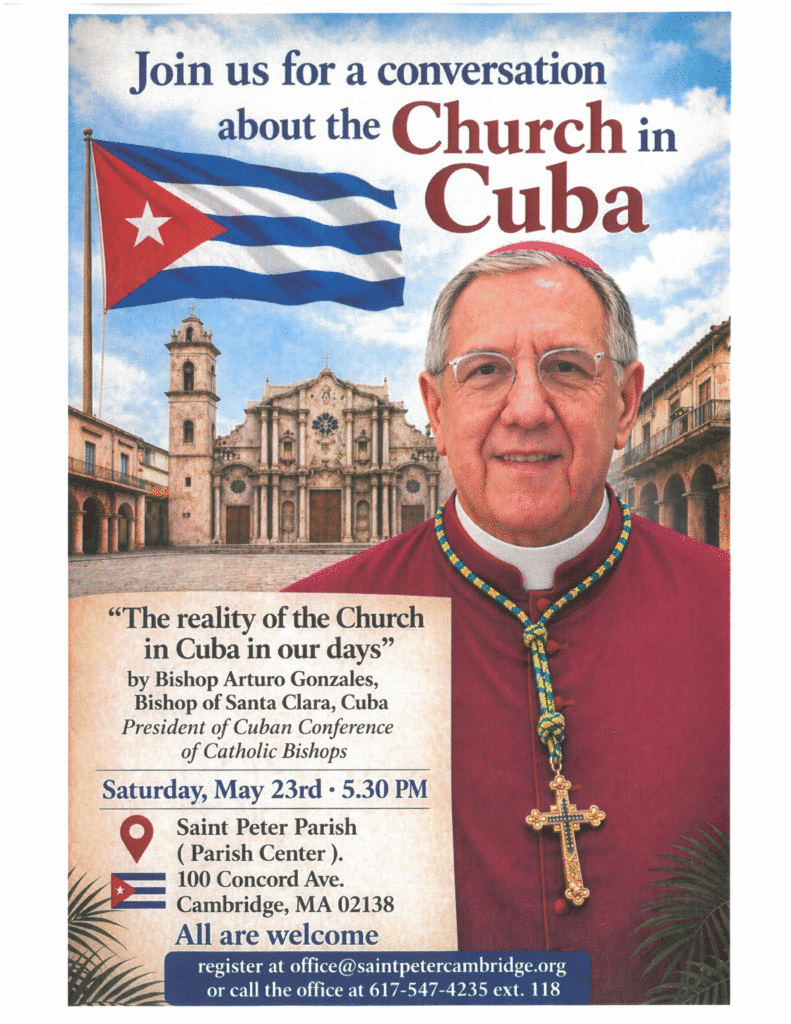 Join us for a conversation about the Church in Cuba on May 23rd at 5:30 PM in the Parish Center .